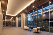 二層吹抜のガラスウォールが目を惹く、優美なるエントランス。街の風景とつながる大きなガラスと温もりのある佇まいが、訪れる人を優しく穏やかに迎え入れます。