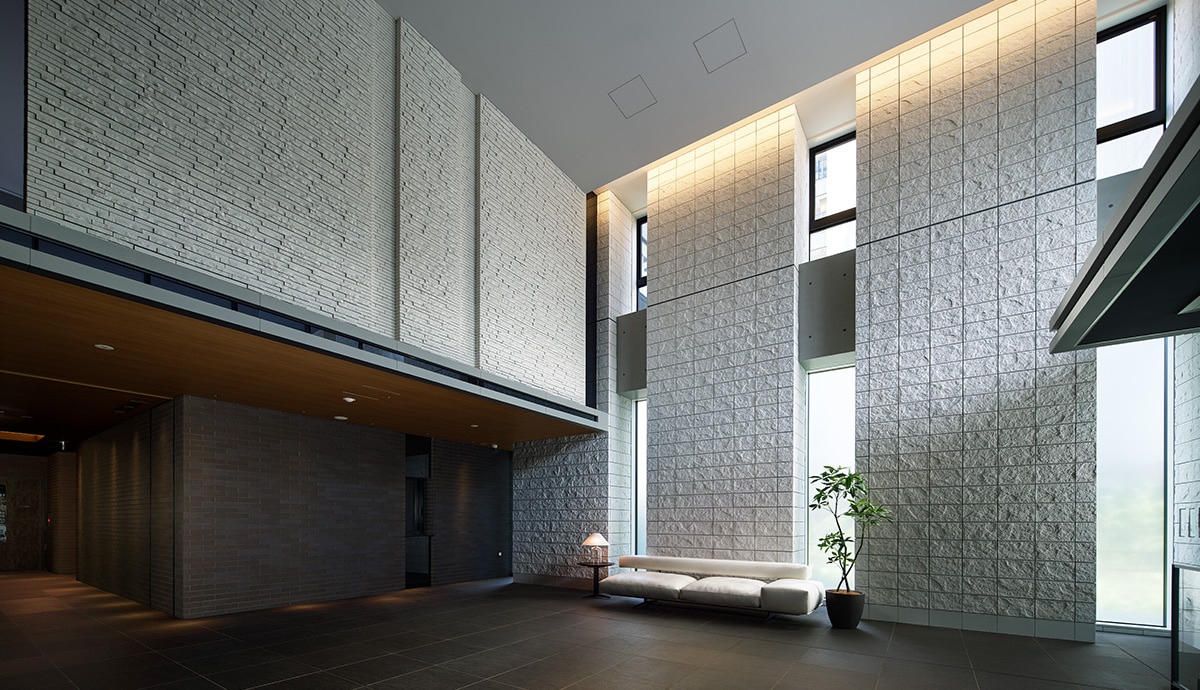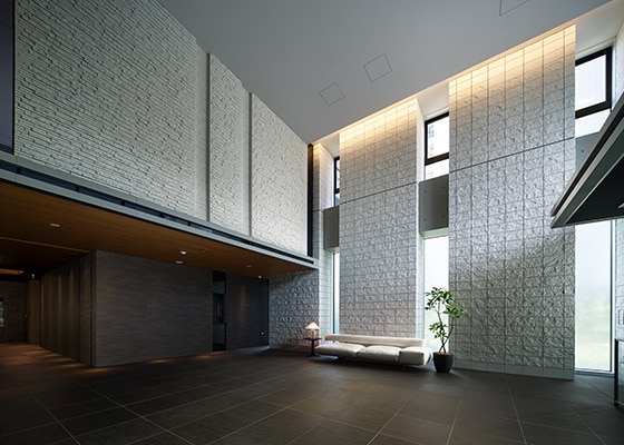 柔らかな光に包まれたエントランス、二層吹き抜けのエントランスホール。