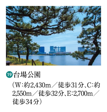 (W:約2,430m/徒歩31分、C:約2,550m/徒歩32分、E:2,700m/徒歩34分)