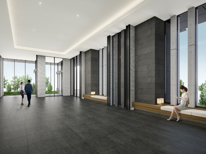 ※掲載のエントランスホール完成予想図は計画段階の図面を基に描き起こしたものに人物等をCG合成したもので、実際とは多少異なります。また、形状の細部および設備機器等については省略しております。