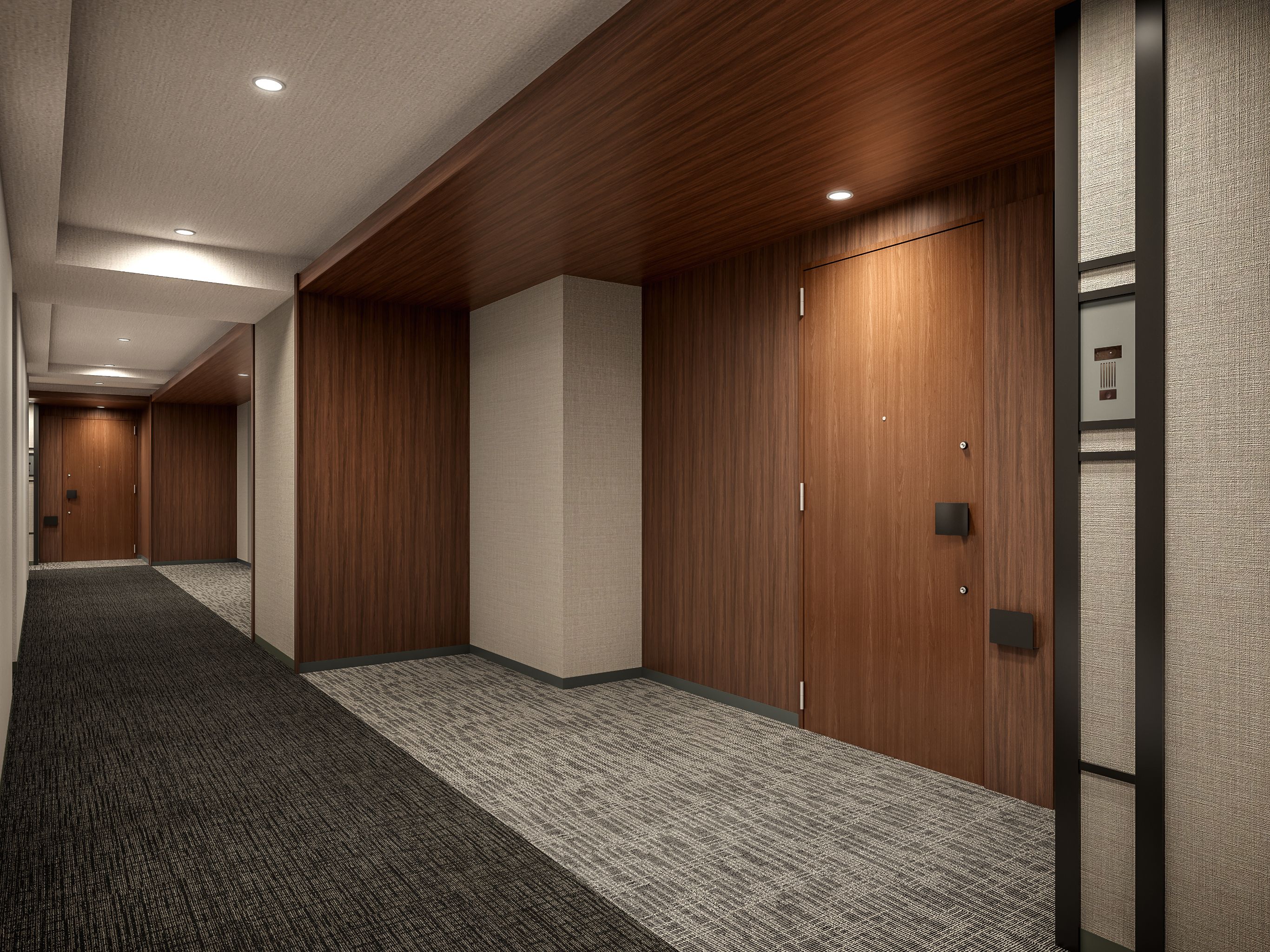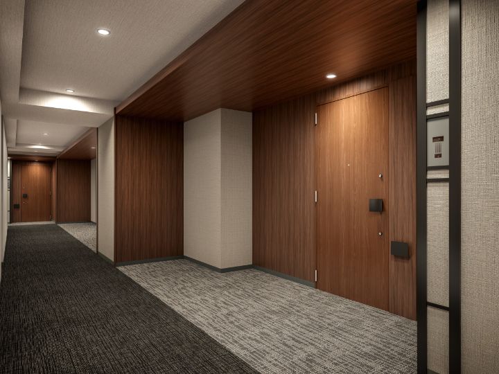 外部の喧騒や視線を遮る内廊下設計が、