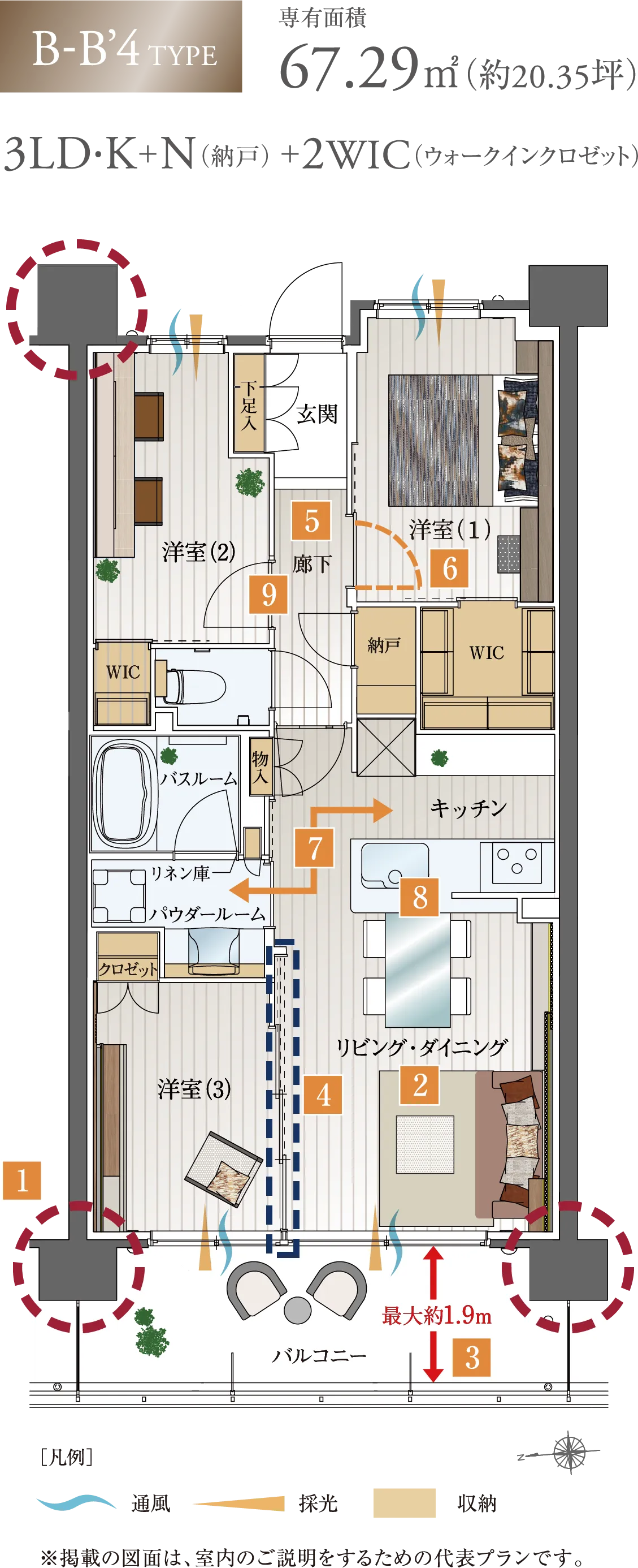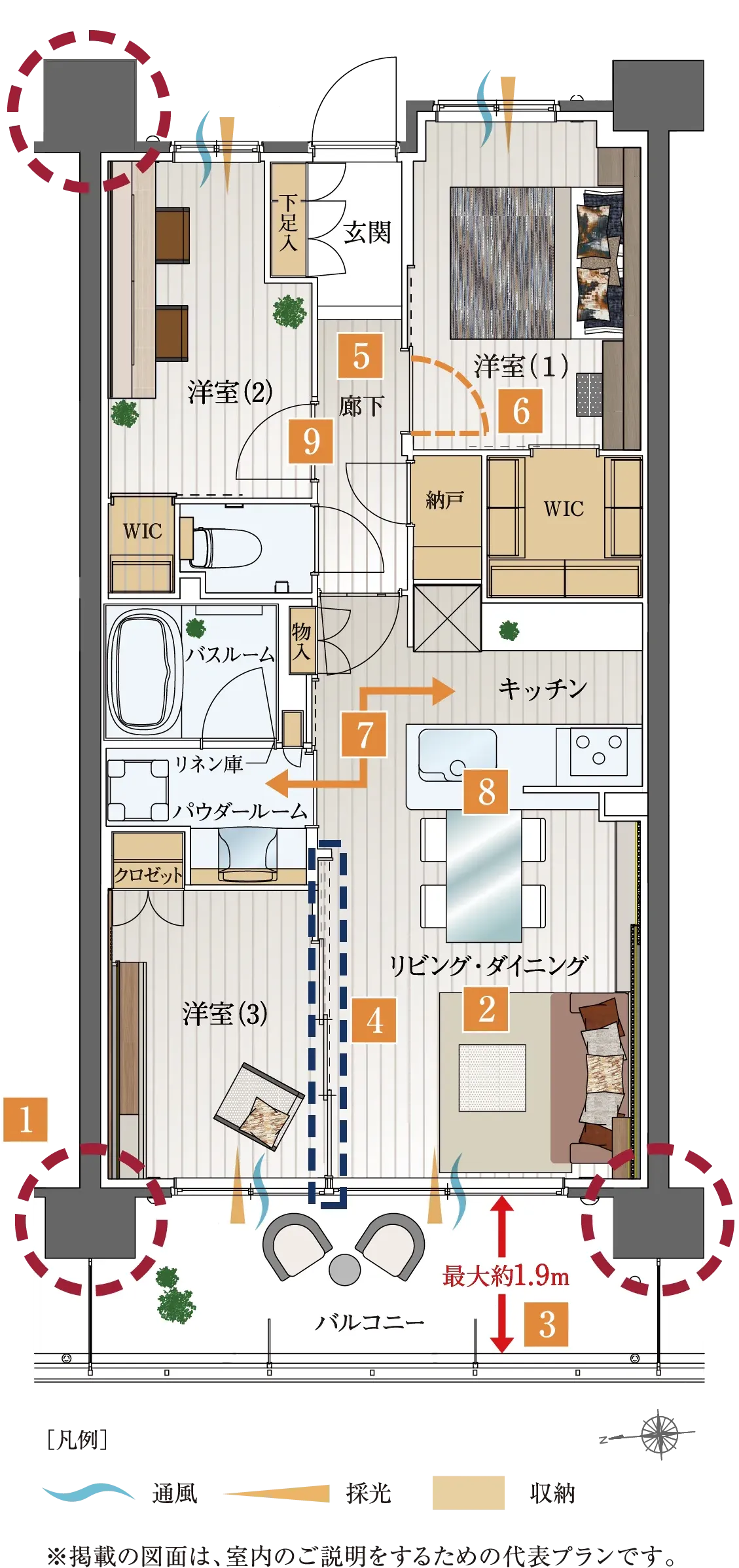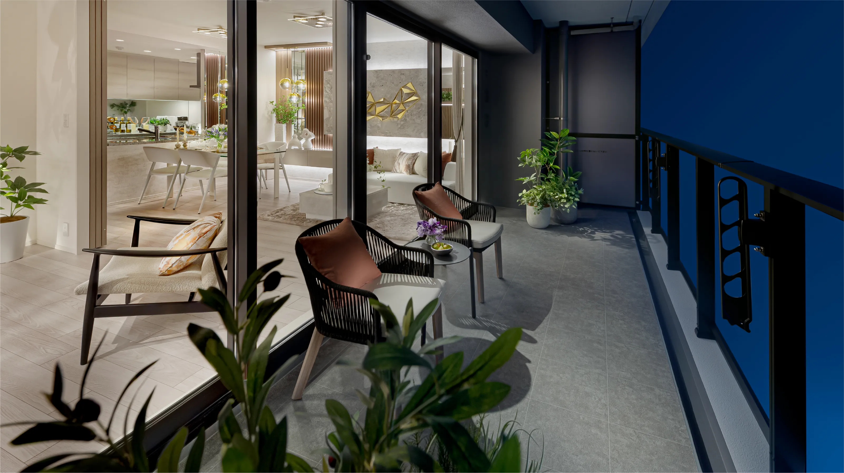 ※バルコニーの家具・植栽・調度品等の配置はイメージです。実際に配置される際には、安全等に十分ご配慮ください。
