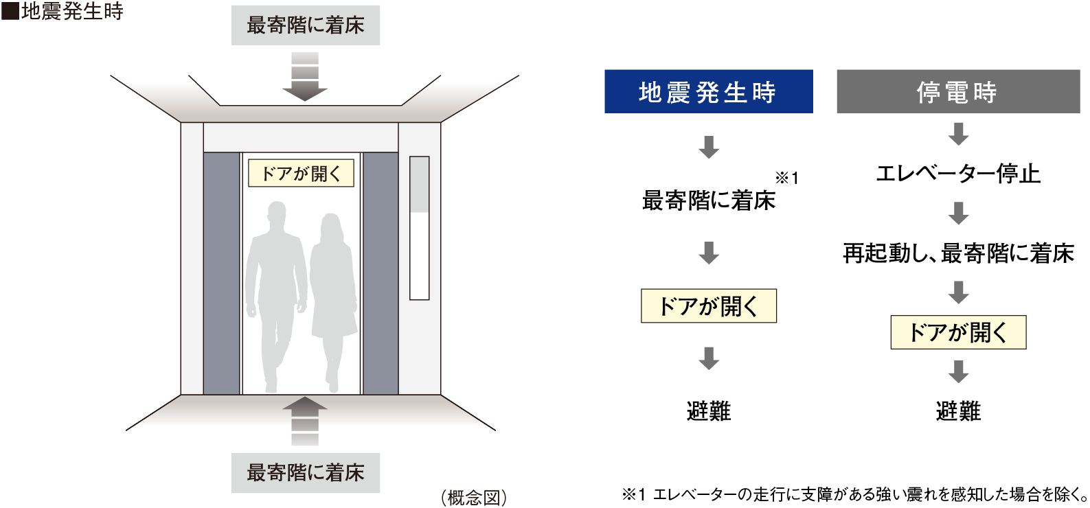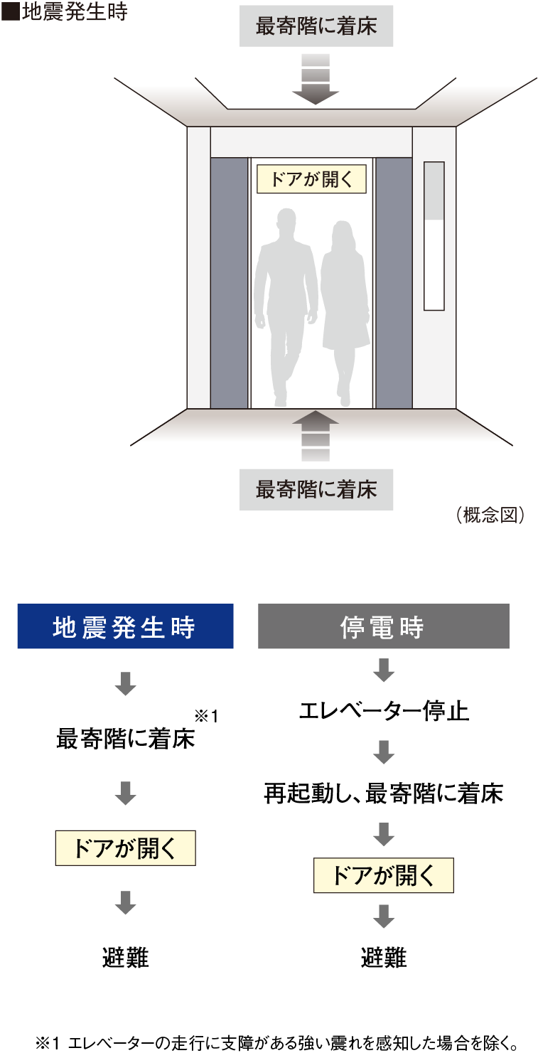 エレベーター運転中に、地震管制装置が一定値を超えた地震を感知すると最寄階に速やかに停止します。また、停電した際には一旦停止後、停電時自動着床装置により最寄階に自動停止し、さらに天井の停電灯が点灯してエレベーター内を照らす他、インターホンが使用できるので外部との連絡も可能です。