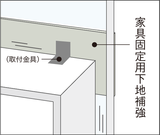家具転倒予防として、冷蔵庫置場の背面に家具固定用下地補強を施しました。