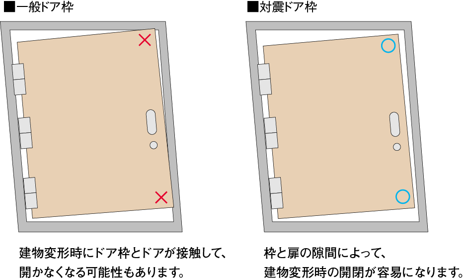 地震によって、玄関扉の枠が歪んでも、枠と扉の隙間を大きく設けることにより、扉の開放を容易にできるように配慮した対震ドア枠を採用しました。