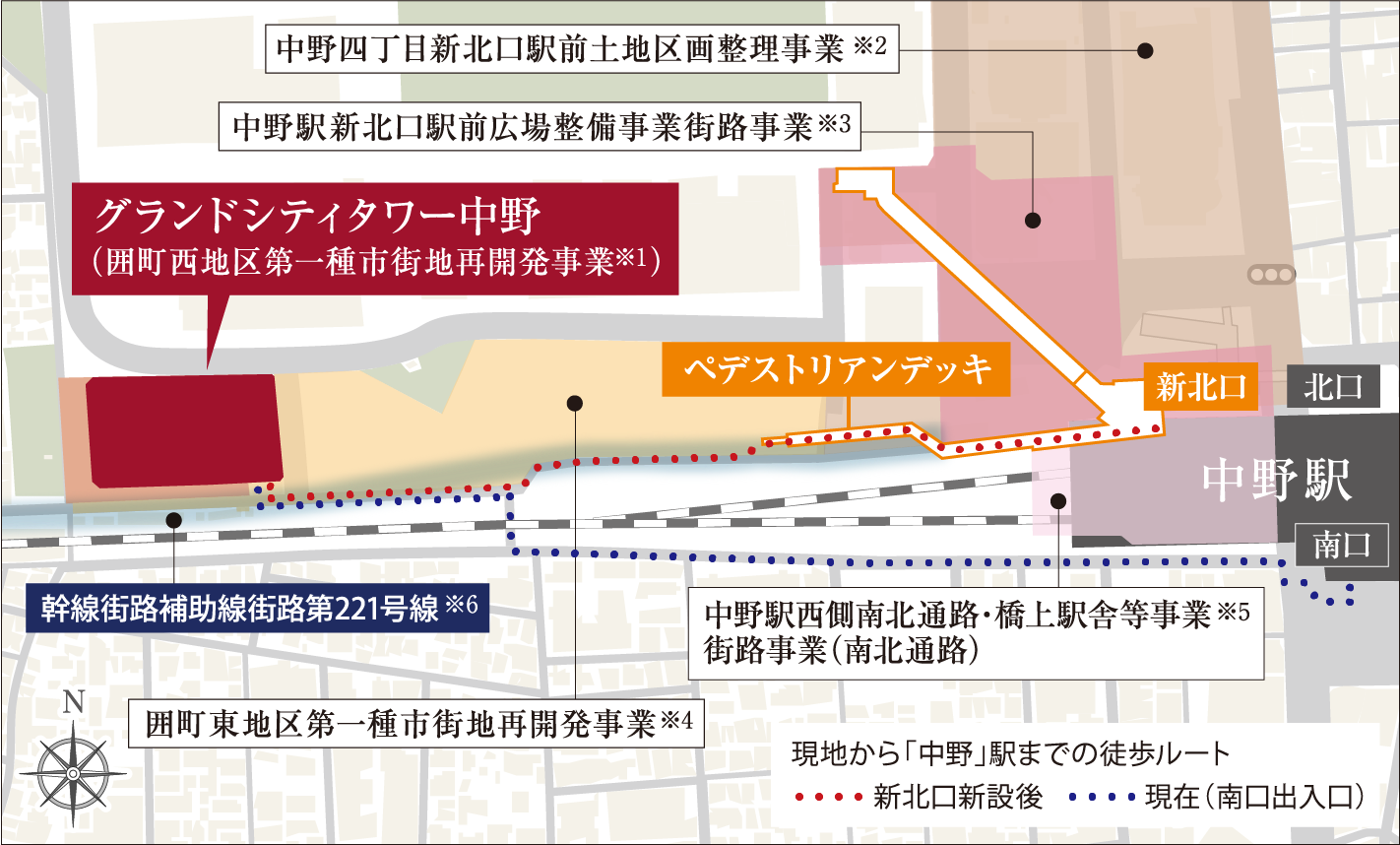 「中野」駅周辺では、交通結節機能の向上を図る都市再生整備が進行中。駅と繋がるペデストリアンデッキや出入口の新設、都市計画道路の整備計画があり、実現すると「グランドシティタワー中野」から駅(新設出入口)までの徒歩分数が6分程度に短縮される見込みです。