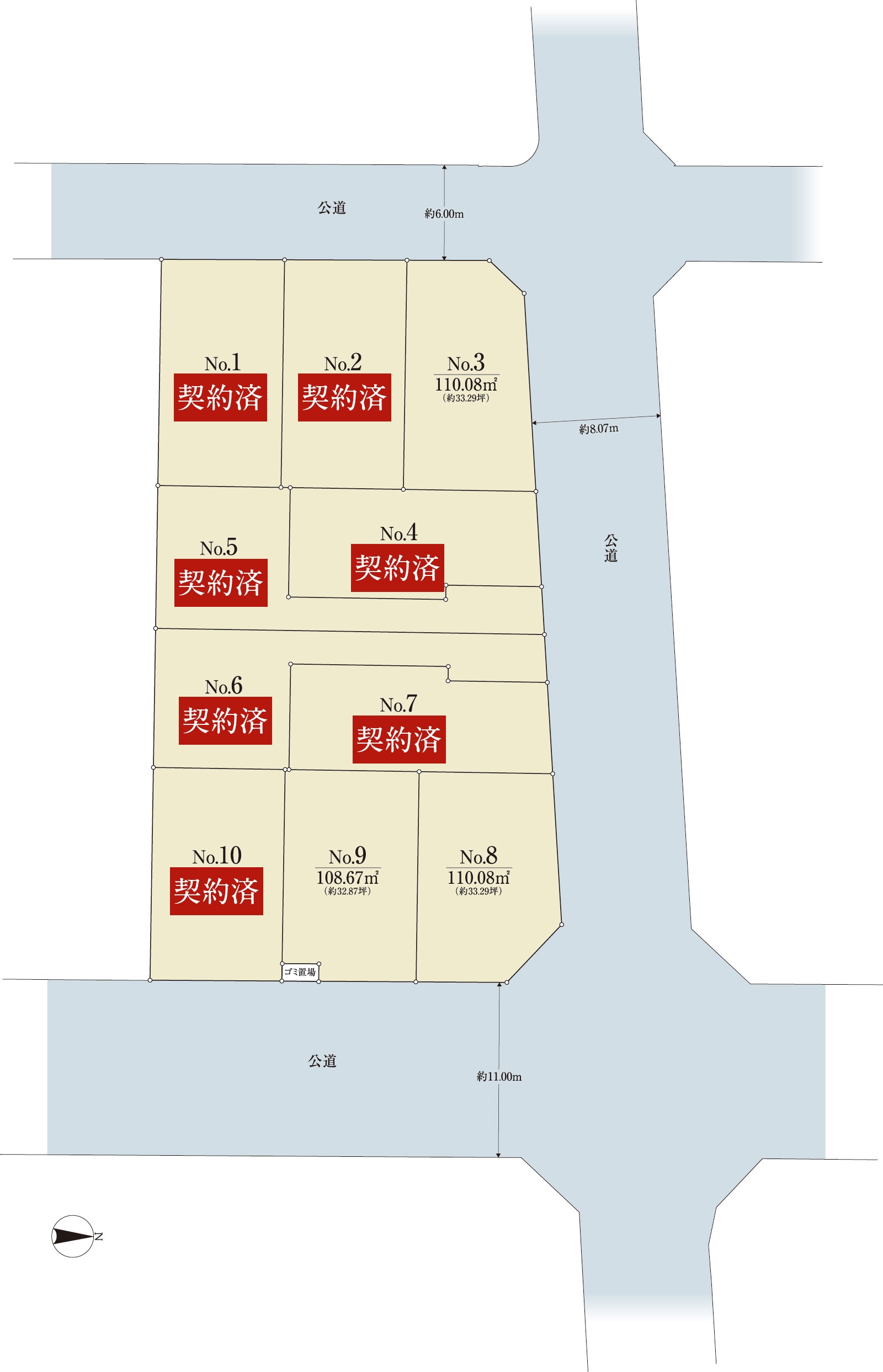 ※ No.8区画:本物件敷地東側約19.63uの部分は都市計画道路予定地となっており、堅固な建物は建築できません。