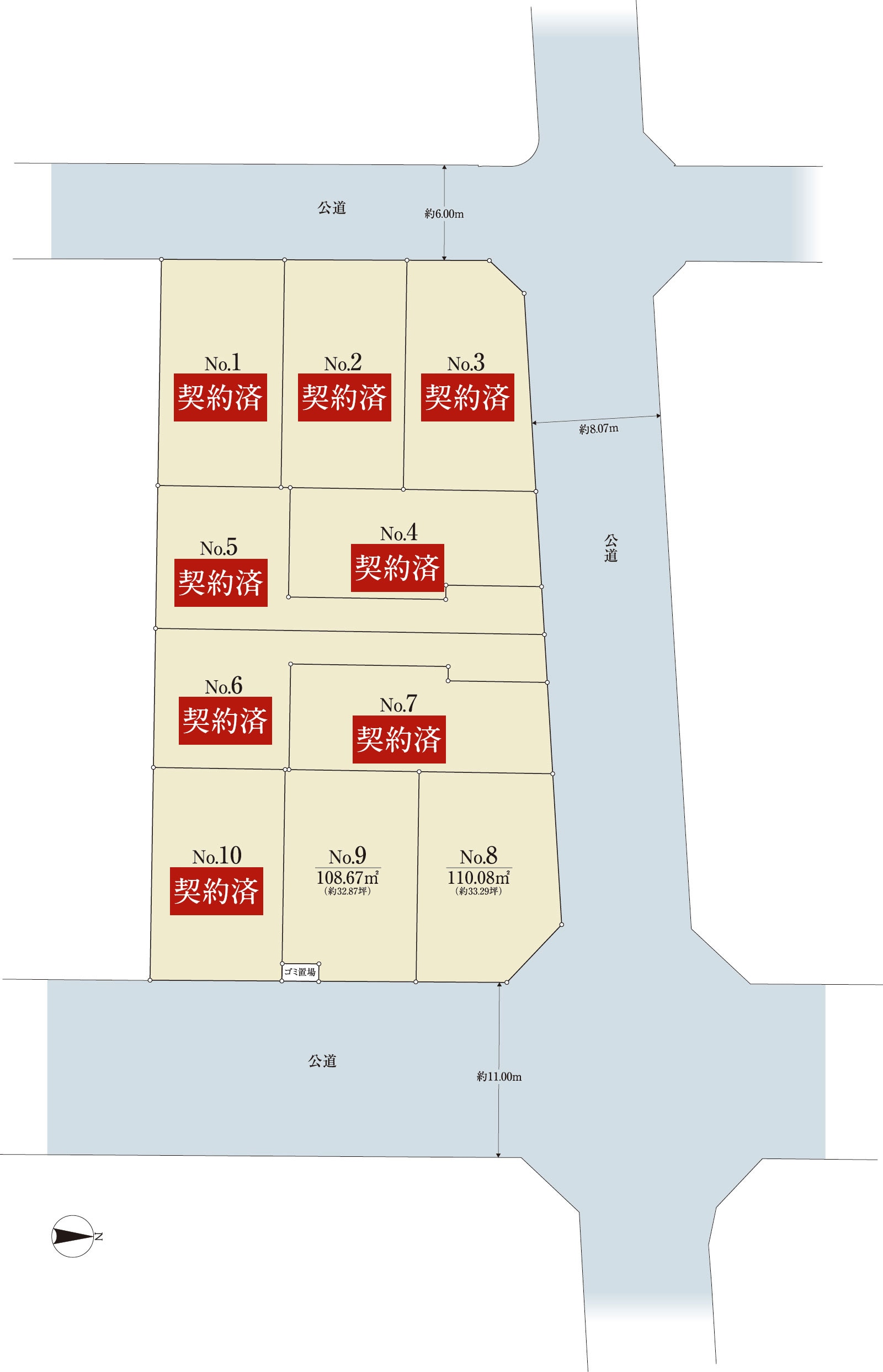※ No.9区画:本物件敷地東側約20.94uの部分は都市計画道路予定地となっており、堅固な建物は建築できません。