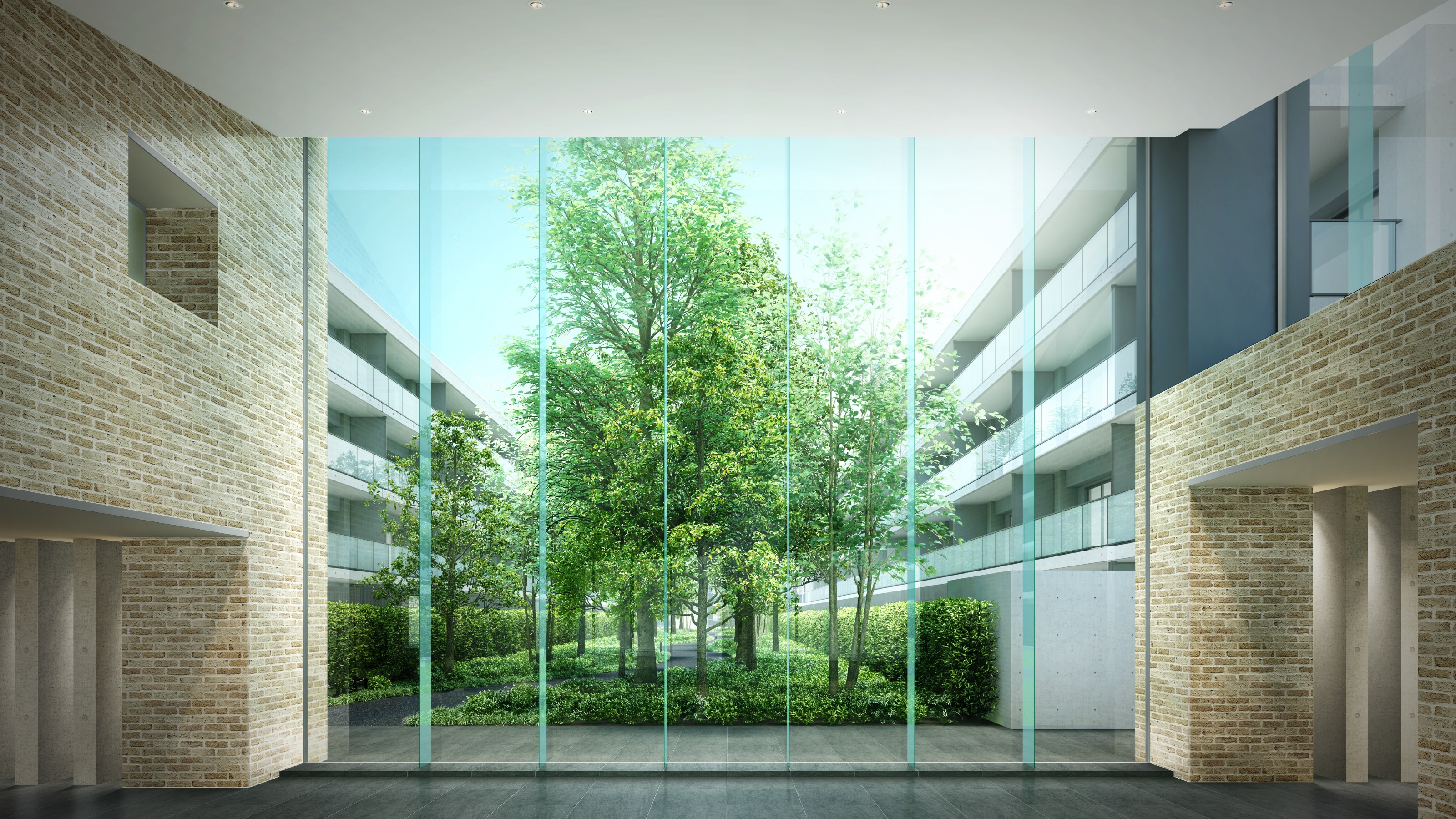 ※掲載の中庭完成予想図は計画段階の図面を基に描き起こしたもので、実際とは多少異なります。また、形状の細部および設備機器等については省略しております。※敷地内の樹木等はある程度生育した後をイメージして描いたものです。また、葉や花の色合い、樹形等はイメージであり実際とは異なります。なお、植栽計画は変更される場合がありますので、あらかじめご了承ください。