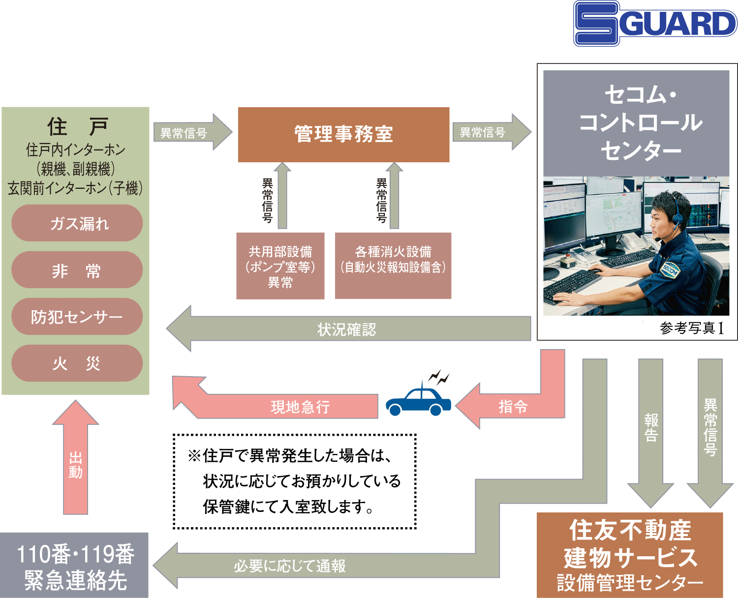 24時間オンライン体制で、セコム(株)セコム・コントロールセンターにつながっています。各住戸、共用部で警報が発信されると、セコム(株)の警備員が現場に急行し、必要な通報などの対応を致します。また、警備業務明細書の規定に従い、事前にお預かりした専有部の鍵を使用した住戸内での対応、共用部設備の異常信号を受信した場合の現地確認等、迅速かつ適切な対処に貢献します。