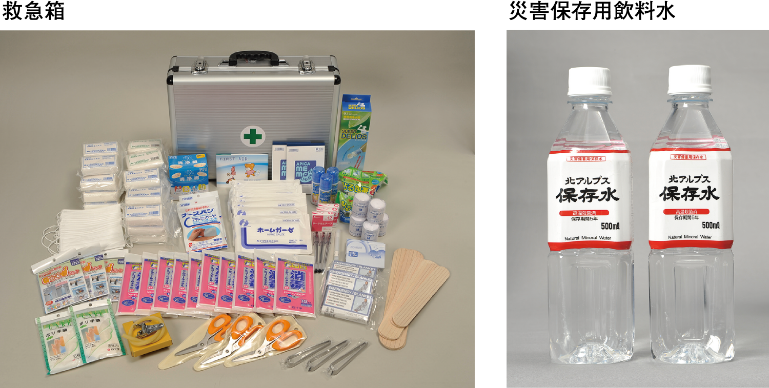 地震などの非常時に備え、防災備品をご用意しました。初期共助に使用する救助用工具セット、 救助用ロープ、 スコップ、 防塵マスクなどを備えています。また、災害時のライフサポート備品として救急箱、 携帯電話充電・懐中電灯機能付き手回し充電ラジオ、カセットガス発電機、 非常用ロウソク、 飲料水用の折りたたみ式給水ポリタンク、 災害保存用飲料水、 災害用簡易トイレなども備えています。