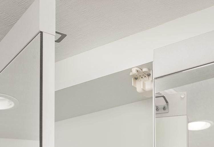 キッチンの吊戸棚、洗面化粧台の三面鏡収納の扉には、地震の揺れによって扉が開いて、収納物が落下しないように、耐震ラッチを設置。住まう方の安全に配慮しています。さらに棚板が外れないように棚板脱落防止用ツメで棚板をしっかり固定しています。