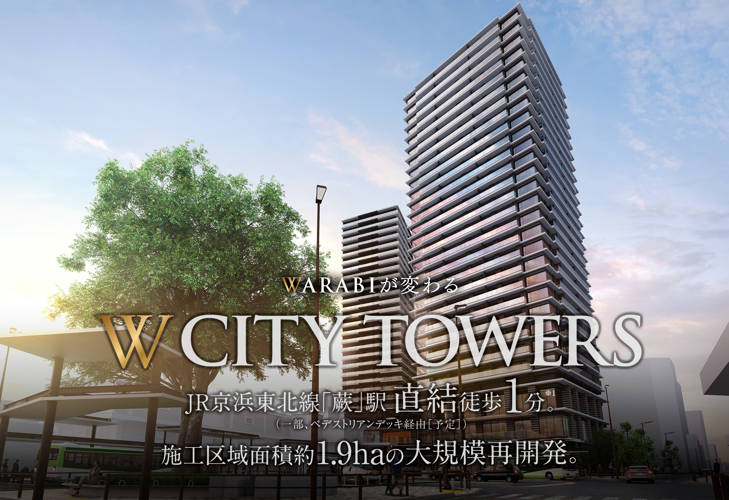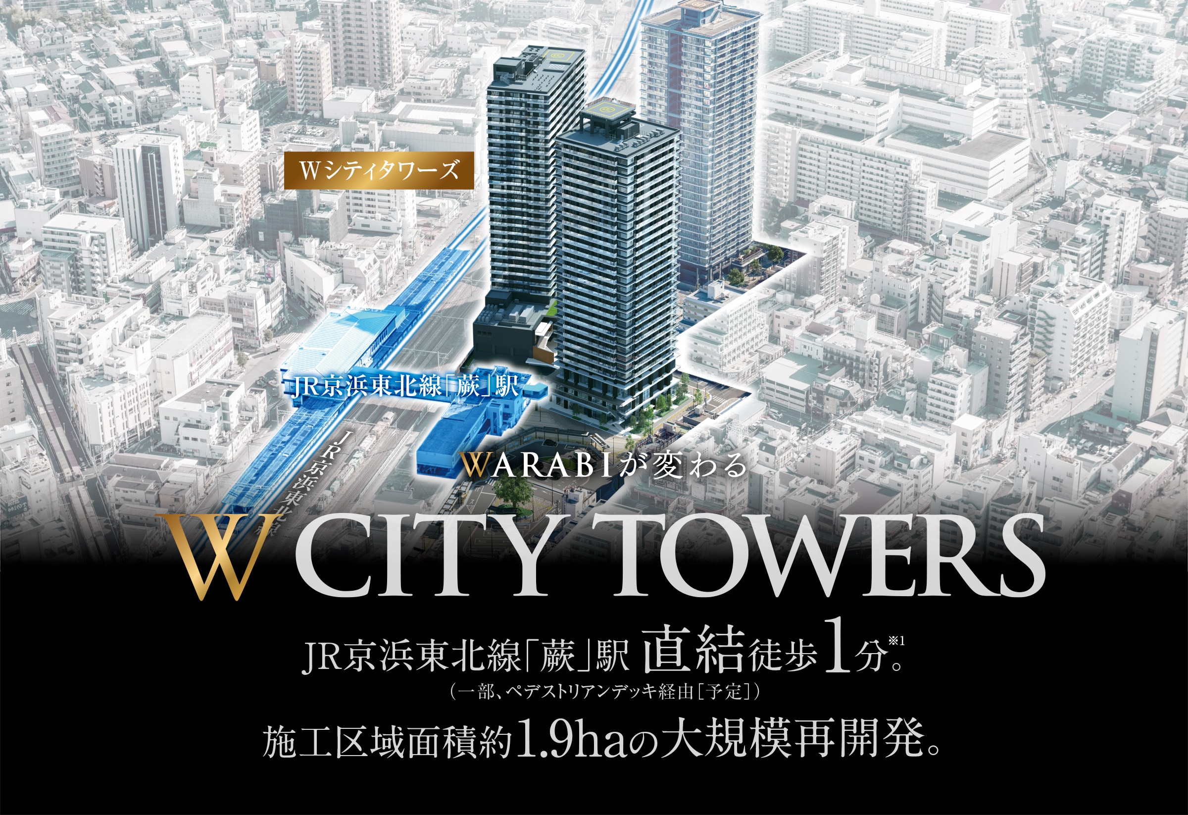 ※1.WEST:徒歩1分/約60m・EAST:徒歩1分/約70m。一部ペデストリアンデッキ経由[予定]とは、東日本旅客鉄道(株)と蕨駅西口地区市街地再開発組合が締結している「蕨駅西口地区第一種市街地再開発事業に伴う蕨駅西口駅舎デッキ接続に関する覚書」により、既存駅舎2階部分と新設されるペデストリアンデッキ(組合所有)が接続される予定です。(完成予定時期:2027年7月 ※工事遅延により遅れる見通しがあります)ペデストリアンデッキの仕様・形状等はイメージであり、実際とは異なります。
