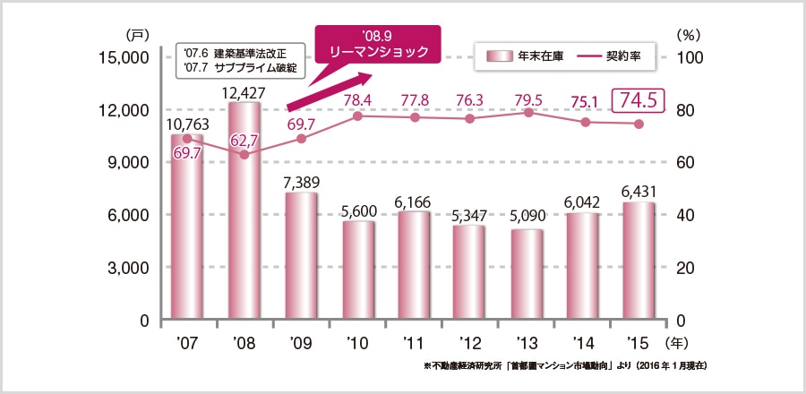 近年の首都圏マンション契約率は1997年の山一証券ショックの際一度落ち込みましたが、その後回復し、比較的安定して高水準を維持してきました。しかし2008 年のリーマンショックによって再び激減することになります。その後深刻な景気の落ち込みに対する政府による景気対策等の効果もあり、2010年〜2015年の年間の契約率は、好調の目安と言われる70% を大きく上回り回復傾向がみえてきています。